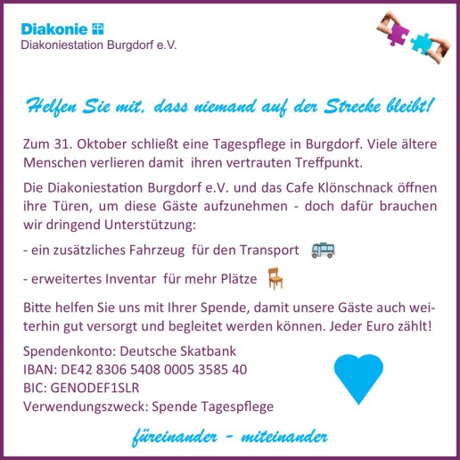 Die Diakoniestation Burgdorf e.V. und das Cafe Klönschnack öffnen ihre Türen, um diese Gäste aufzunehmen - doch dafür brauchen wir dringend Unterstützung: